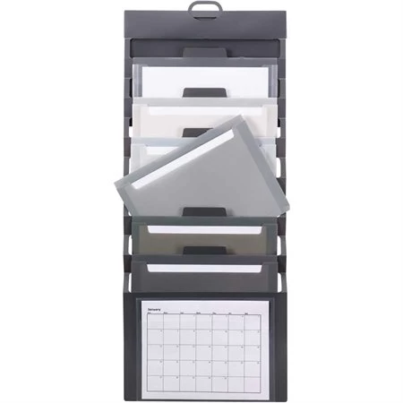 Polypropylène. Les 6 pochettes sont amovibles pour plus d’accessibilité. Cordon élastique pour plus de sécurité au transport. Une pochette peut contenir 25 feuilles. La pochette transparente à l’avant peut contenir plus de rangement. Crochet pour suspendre. Format lettre. Fond gris.