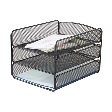 Fabriqué de treillis métallique. 3 plateaux emboîtables. Pour chemises ou documents de format lettre. 8 H x 9-1/4 x 11-3/4 po. Noir.