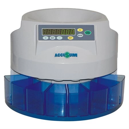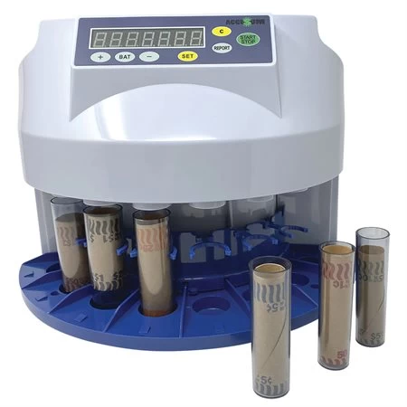 Pour le décompte et le tri des pièces de monnaie. Il est possible de sélectionner un nombre spécifique de pièces par bac afin de faire des rouleaux. Vitesse de 200 pièces par minute. Capacité de chargement de 500 pièces. Mise en lots programmable. Pour marché canadien seulement.