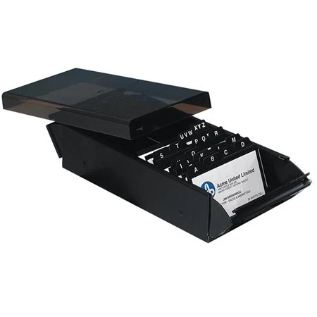 Couvercle amovible transparent. Séparateur de A à Z inclus. Capacité de 600 cartes. Noir.