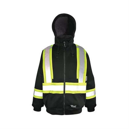 Molleton de tricot de polyester avec doublure de coton procurant une respirabilité supérieure et un contact doux pour la peau. Capuchon trois pièces détachable avec fermeture à cordon élastique et barillet. Protège-menton en tissu au haut de la glissière. Bandes réfléchissantes doubles à la poitrine. Glissière plein longueur à l’avant. Poignets et ceinture en tricot pour plus de confort et un ajustement serré. Entièrement conforme aux normes CSA Z96-15 Classe 2, Niveau 2. Entièrement conforme aux normes ANSI/ISEA 107-2015 Type O Classe 1, non FR. Vendu à l’unité. Noir.