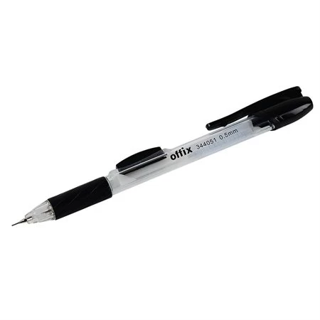 Mécanisme à bouton-poussoir latéral. Manchon coulissant. 0,5 mm. Boîte de 12. Corps transparent avec accents noirs.