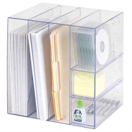 Rangement des lettres et chemises à dossier dans 3 compartiments. 2 tiroirs amovibles pour les petits accessoires. Peut être installé au mur. Peut accomoder des documents de format lettre ou A4. 10 x 13,25 x 13,25 po. Clair.